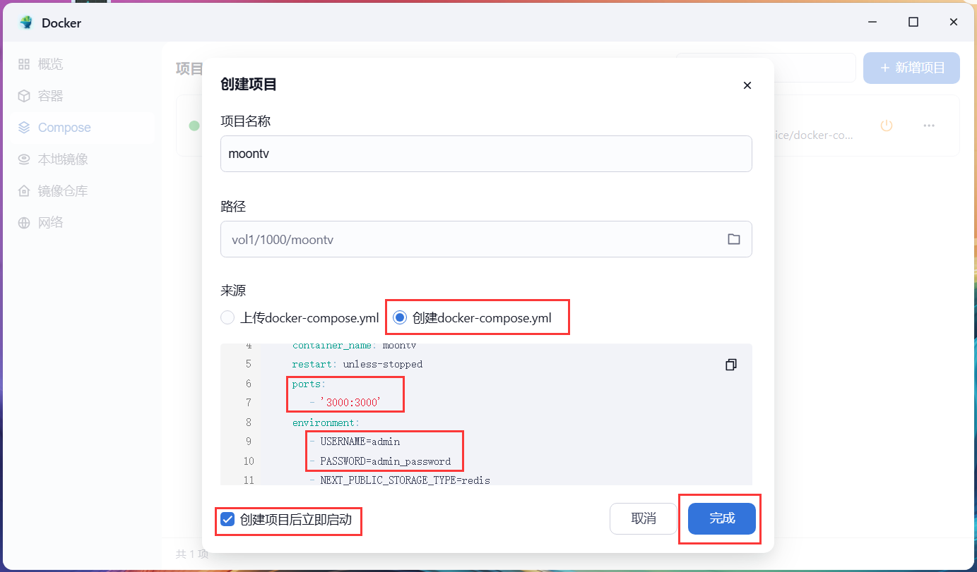 4,来源选择创建 docker compose ,粘贴刚才的 redis 版本进去,端口 3000 如果本地有冲突可以修改(这里我改成了3020端口),然后创建一个你自己的密码,勾选立即启动后,点击【完成】。