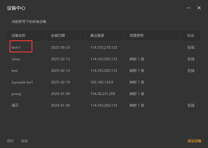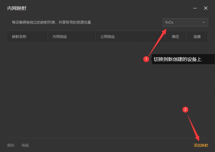 4,注意右上角的设备名称下拉框,这里选中刚刚添加的设备名称,此时在这个界面上添加的映射,就属于刚刚这个设备。添加或修改一般需要等待30秒,容器中的路由侠进程就会更新并加载。切换好设备后,点击【添加映射】。