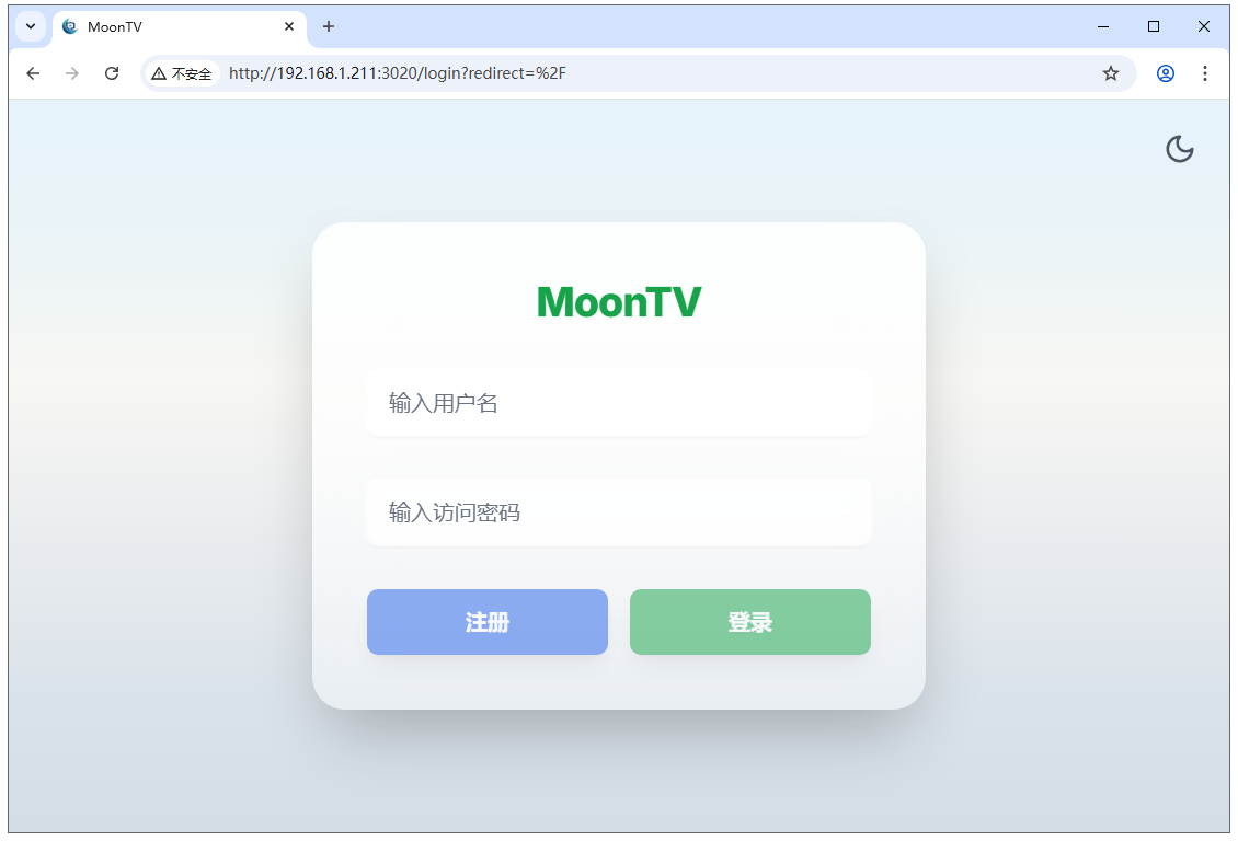 7,浏览器中访问 fnOS 飞牛 NAS 主机地址加端口号 , http://飞牛IP:端口 。就可以看到 moontv 登录界面了。用刚才创建的用户名和密码登录进去即可。