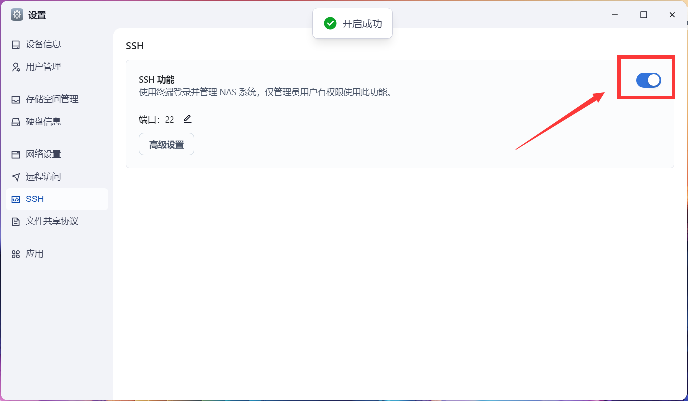 1,在内网把飞牛云 NAS 设置界面打开,在设置里开启 ssh 连接,端口默认为 22 ,如下图,开启后,我们就可以 ssh 连接飞牛云 NAS 执行命令。