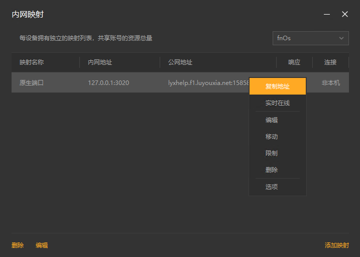 7,创建好后,就可以看到一条映射的公网地址,鼠标右键点击【复制地址】。