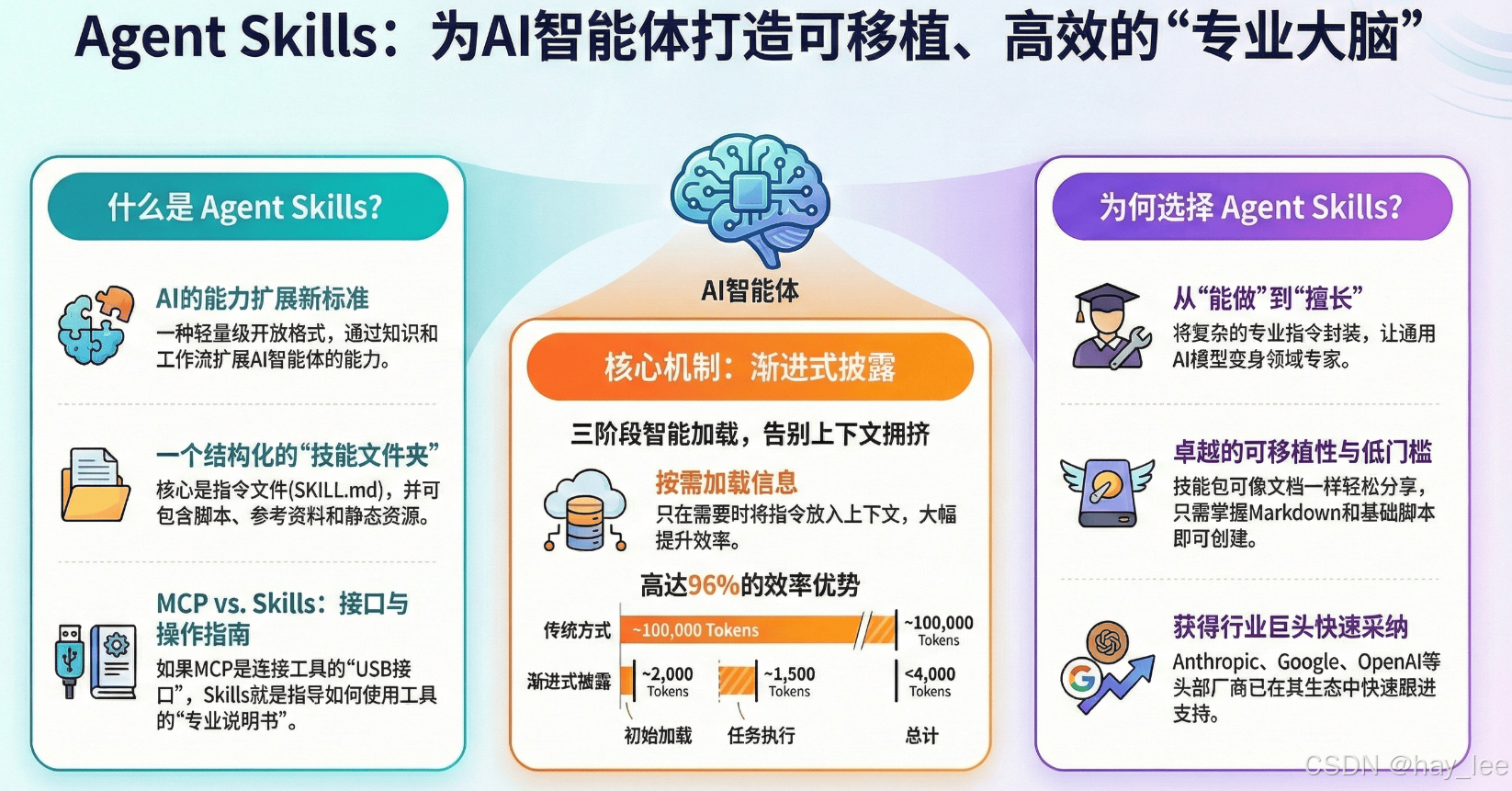 在瞬息万变的 AI 领域,2025 年无疑是智能体(Agent)技术走向成熟的关键一年。这一年,行业经历了从"功能摸索"到"标准建立"的剧烈演变。几个月前,由 Anthropic 提出的 MCP(Model Context Protocol)还是开发者们眼中的"小甜甜",它通过标准化智能体与外部工具和数据源的通信方式,一举解决了连接碎片化的难题。然而,风向变化总是猝不及防------随着 Agent Skills 开放标准的横空出世,AI 开发的焦点正迅速从"如何连接"转向"如何执行"。