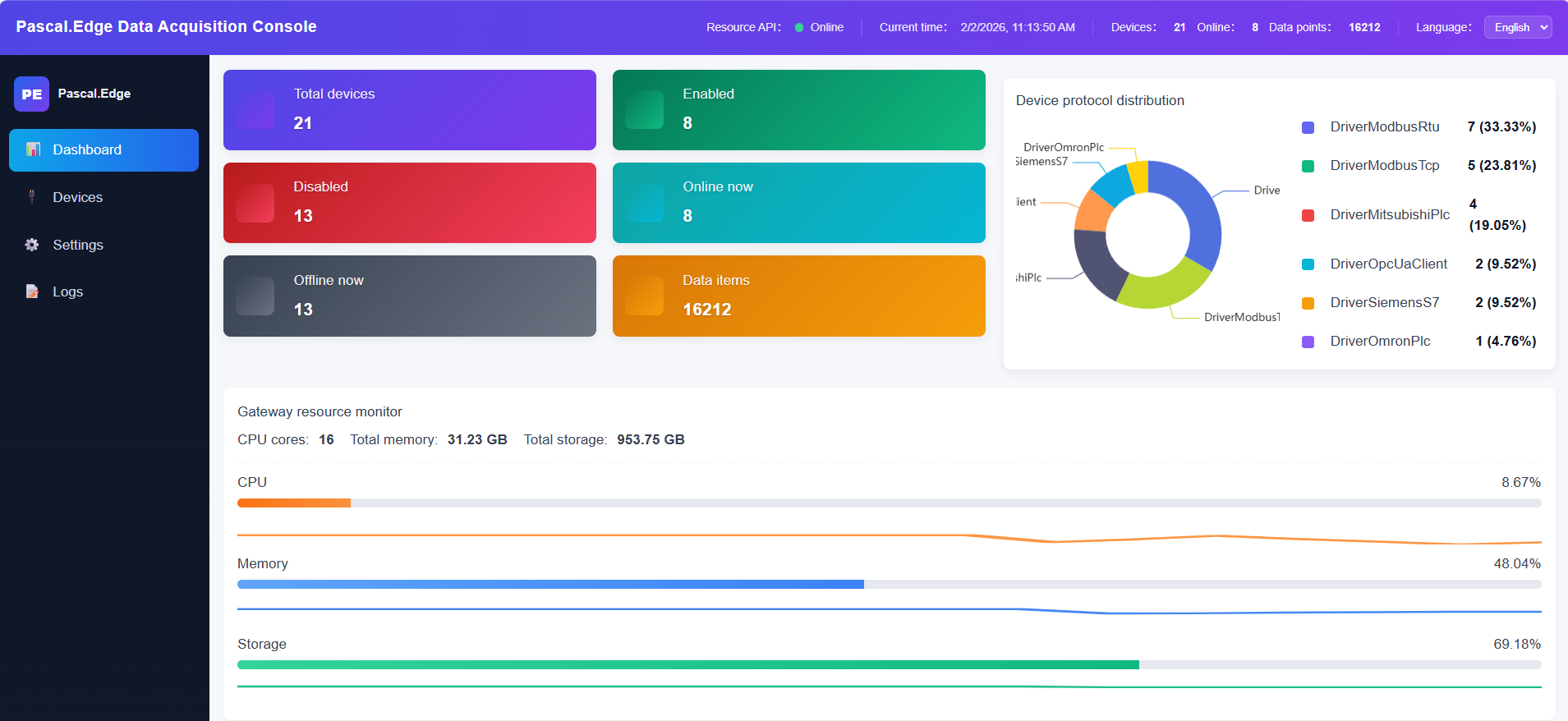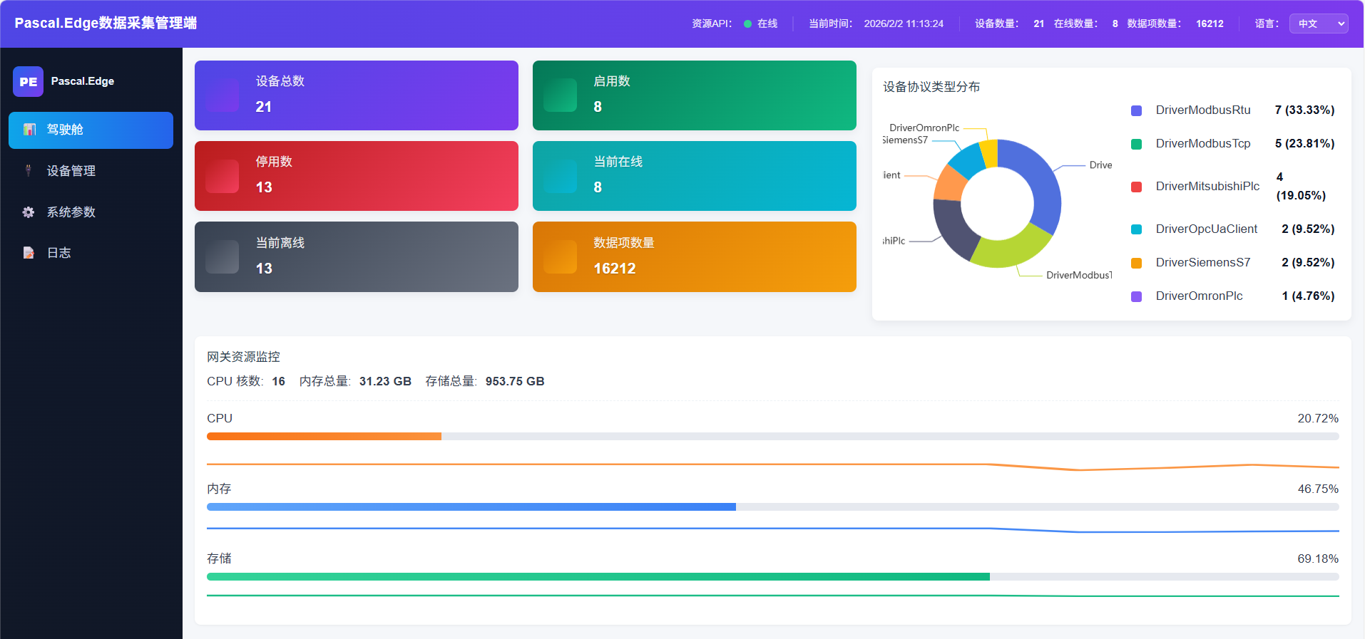 驾驶舱提供设备数、点位数、协议分布情况和资源分布情况概览。