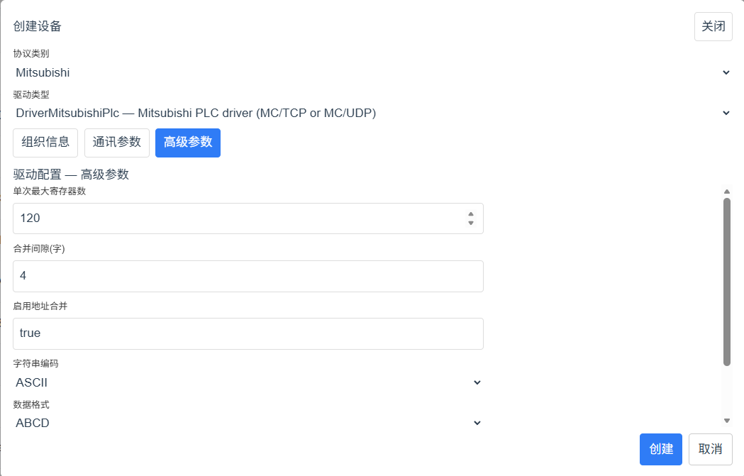设备创建,根据协议类别、驱动类型动态生成设备参数。主要有: