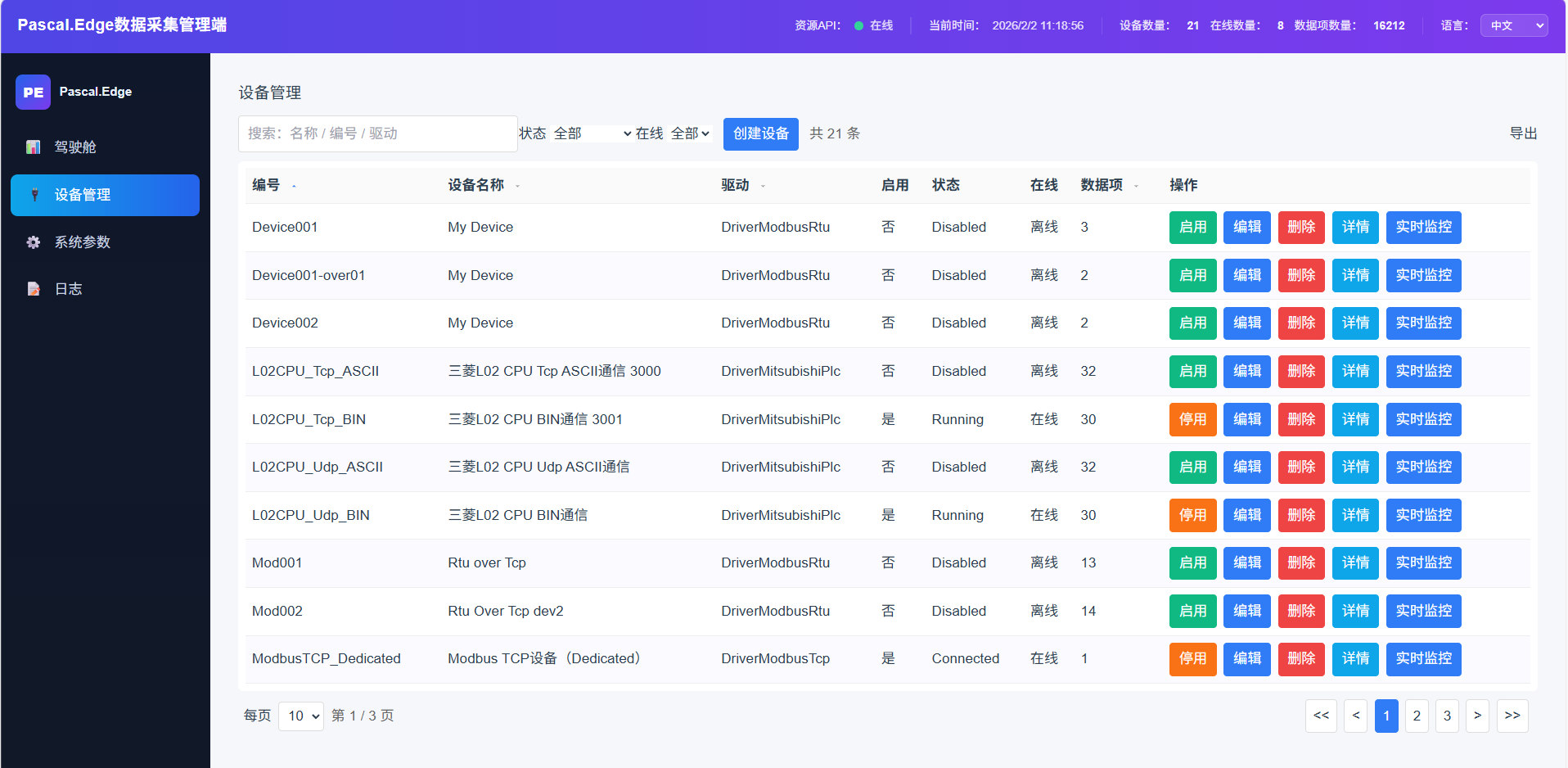 设备管理提供设备明细、设备创建、删除、编辑、点位维护、实时监控等功能。