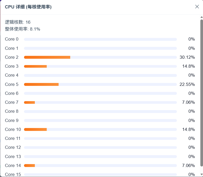 CPU和存储提供明细查询,可以查CPU每核使用率、存储每个分区使用率详细数据。