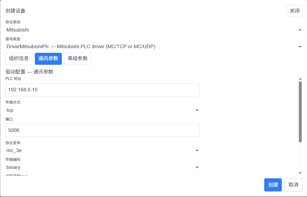 通讯参数:提供通讯相关的参数,比如设备IP、端口等。