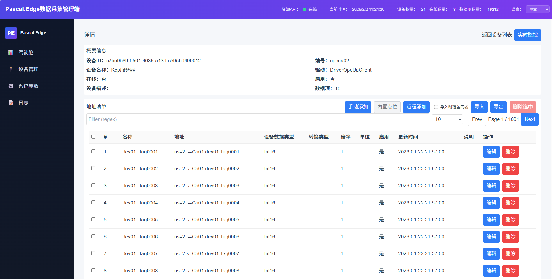 设备详情,用于维护设备点位信息,支持导入导出。支持手动添加、内置点位选择、远程添加等。内置点位和远程添加由后端驱动决定是否启用。一般PLC设备没有内置点位,OPC设备有远程添加点位、仪器仪表有内置点位。