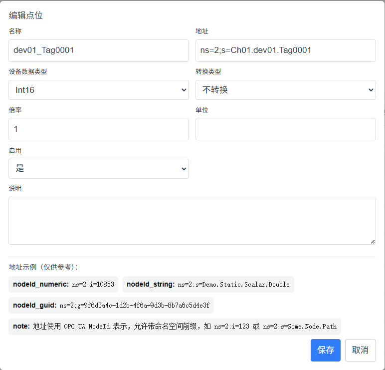 手工添加和编辑点位是,驱动端提供地址示例,名称和地址由后端驱动提供正则表达式对输入内容进行约束校验。设备数据类型和转换类型,也由驱动维护,允许对数据进行倍率调整,允许对单个点位进行启停控制。