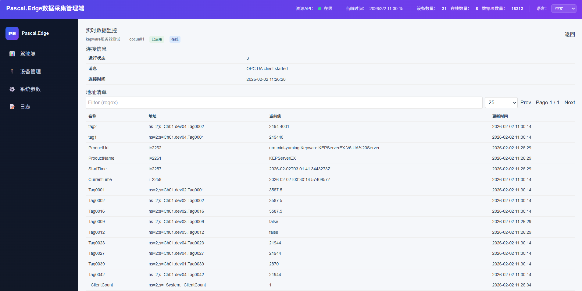 实时监控,可以看到连接信息和点位实时值。