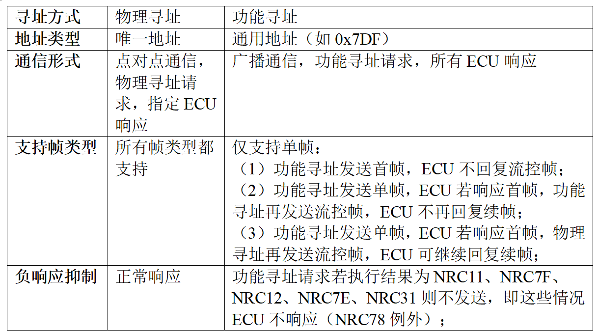 1、物理寻址始终是发送至单个ECU中服务器的专用消息。当采用物理寻址时,通信是客户端与服务器之间的点对点通信。(ISO 14229-1 2020 7.4.1.4)