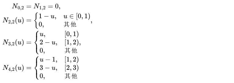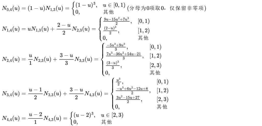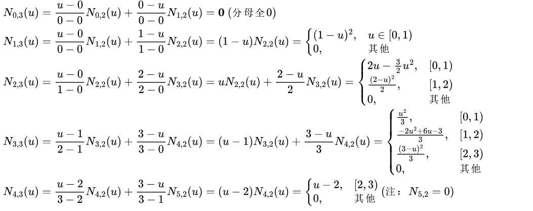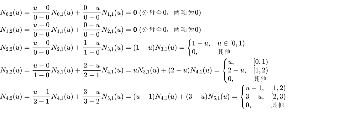 结合一阶基函数结果 + 节点向量U,除零判断后分区间化简: