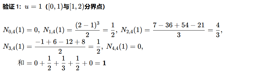 取有效区间内任意点 (如区间分界点u=1、u=2,内部点u=1.5),代入三阶基函数(k=4)计算和,验证和恒为 1(推导正确性核心依据)。