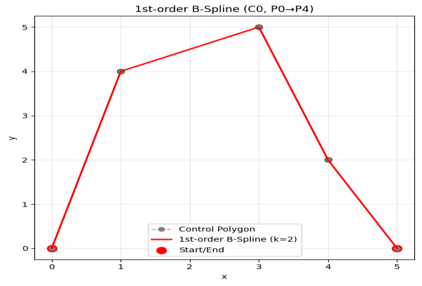 一阶 B 样条(k=2):分段线性曲线,仅C0连续(视觉上有折角),紧贴控制多边形,局部控制性最强,但光滑性最差。