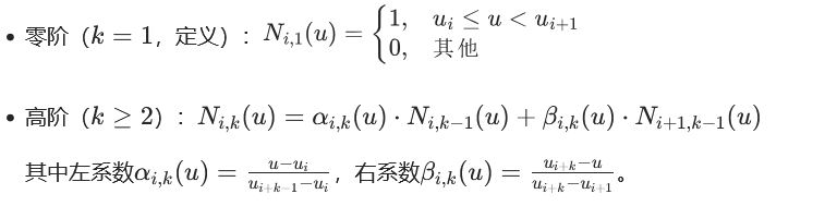 - 递推逻辑链:零阶(k=1,定义)→一阶(k=2)→二阶(k=3)→三阶(k=4) ,高阶基函数仅由低一阶基函数 和节点向量决定,无未知量,递推唯一;
