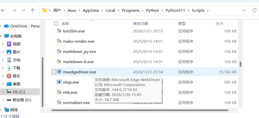 为了让 Python 能全局找到驱动,推荐把驱动文件放到 Python 的 Scripts 目录下(例如:C:\Python311\Scripts)。