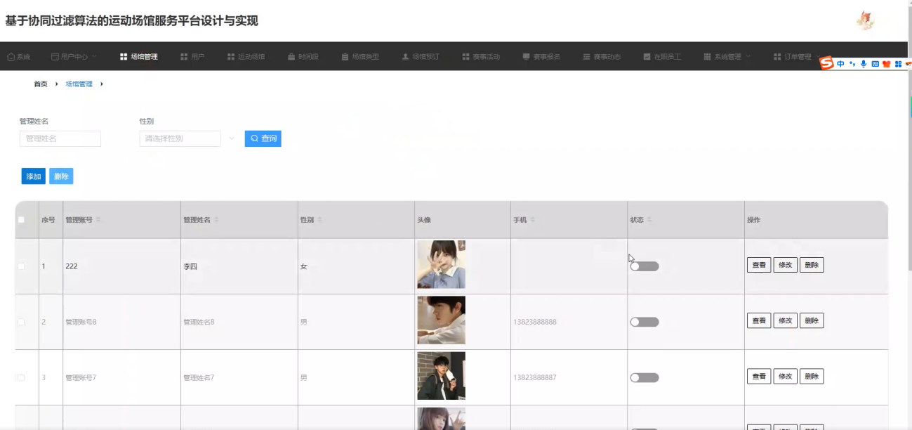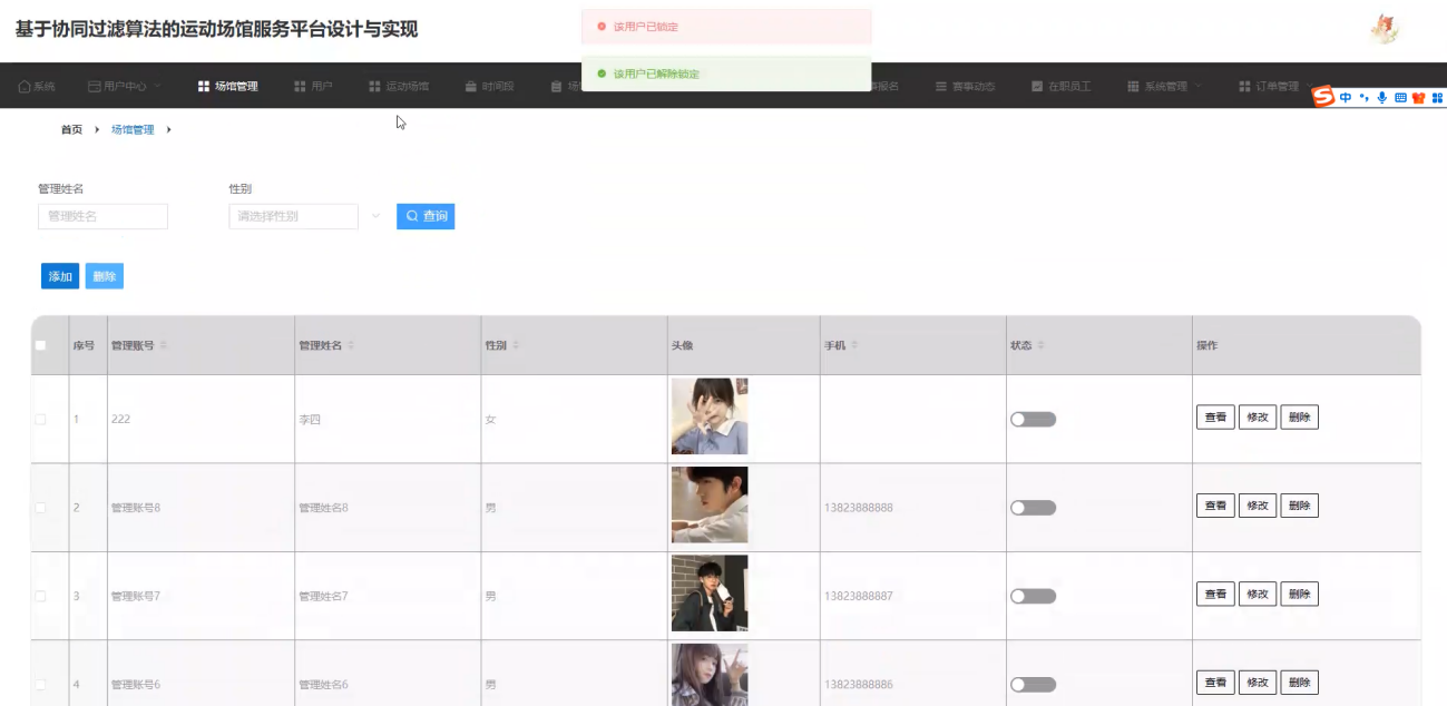 用户与场馆管理:管理用户账号(封禁违规账号、设置用户权限),审核新增场馆及场馆信息更新申请,保障信息真实准确。