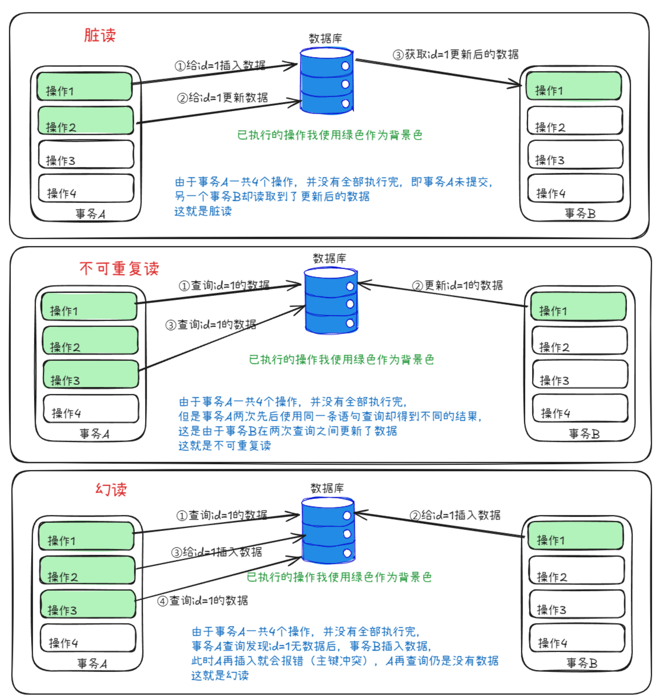 | 隔离级别 | 脏读 | 不可重复读 | 幻读 |