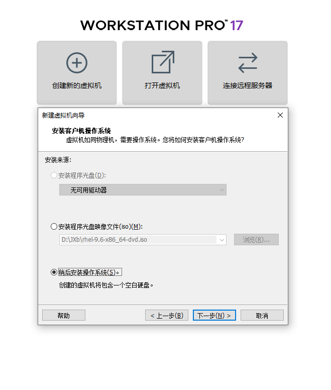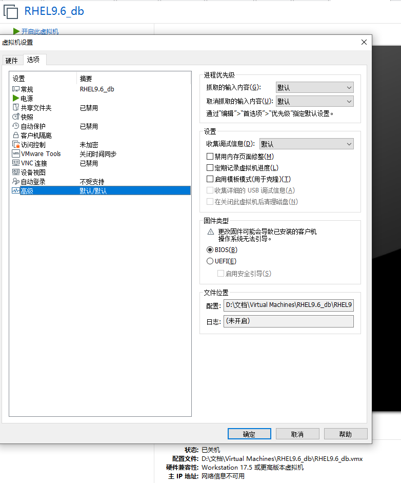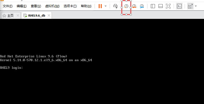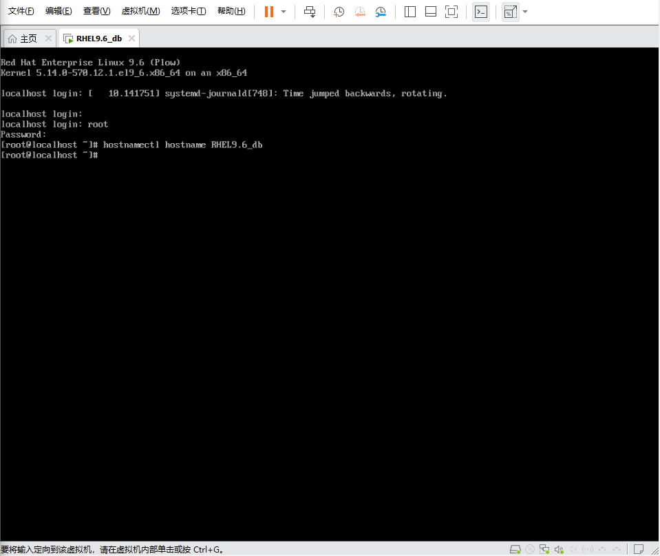 输入用户(root)和密码,然后给主机重命名RHEL9.6_db;然后点击导航栏上的虚拟机------可移动设备------CD/DVD------连接或者点击右下角倒数第二个圆圈图标------连接(都是连接镜像的)