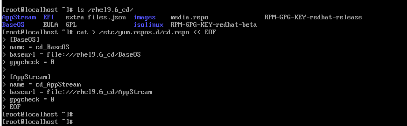 root@RHEL9 \~\]# mkdir /rhel9.6_cd \[root@RHEL9 \~\]# mount /dev/sr0 /rhel9.6_cd/ \[root@RHEL9 \~\]# cat \> /etc/yum.repos.d/cd.repo \<\< EOF \[BaseOS