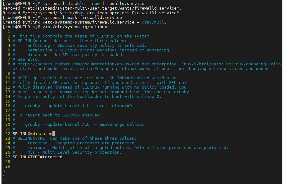 root@RHEL9 \~\]# systemctl disable --now firewalld.service Removed "/etc/systemd/system/multi-user.target.wants/firewalld.service". Removed "/etc/systemd/system/dbus-org.fedoraproject.FirewallD1.service". \[root@RHEL9 \~\]# systemctl mask firewalld.service Created symlink /etc/systemd/system/firewalld.service → /dev/null. \[root@RHEL9 \~\]# vim /etc/sysconfig/selinux