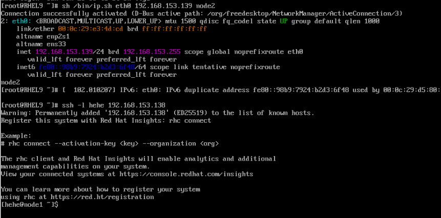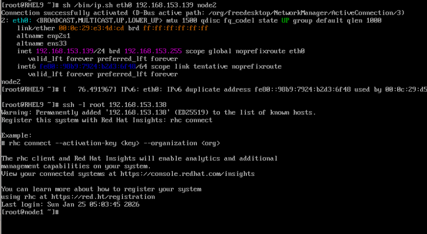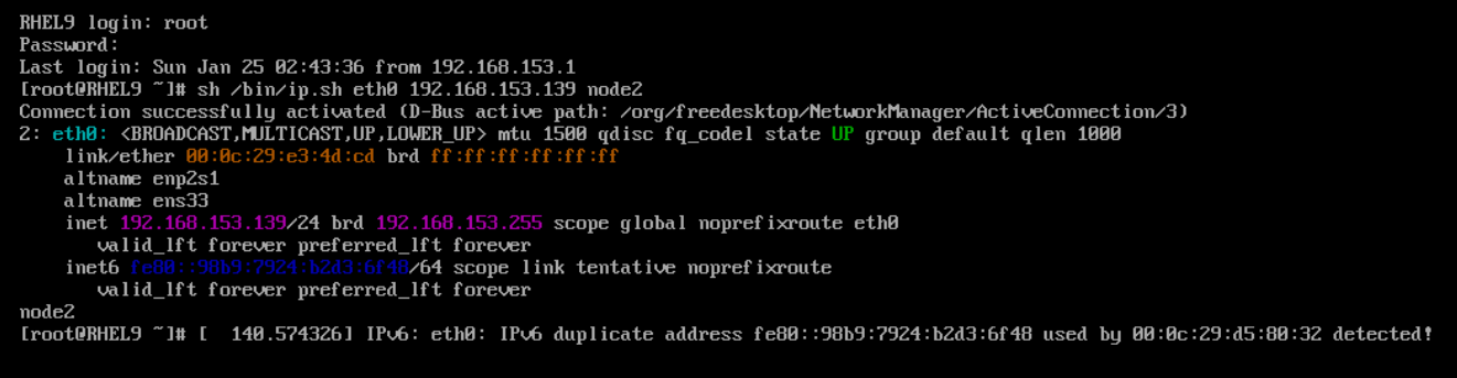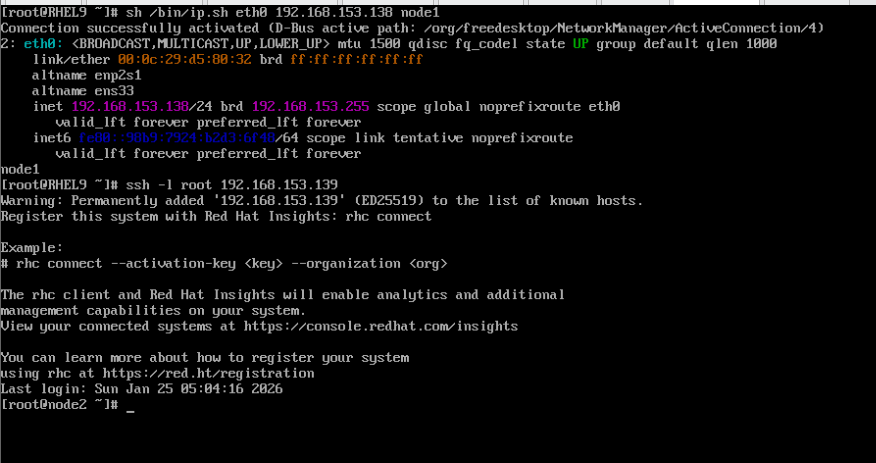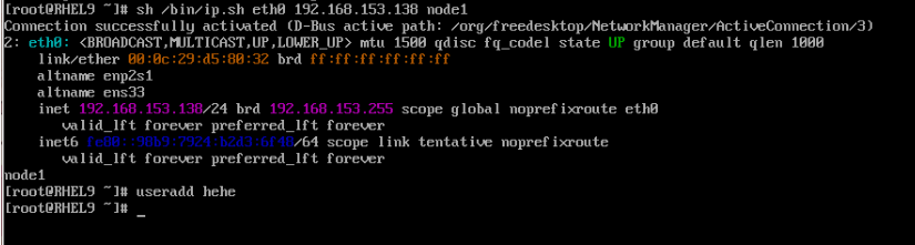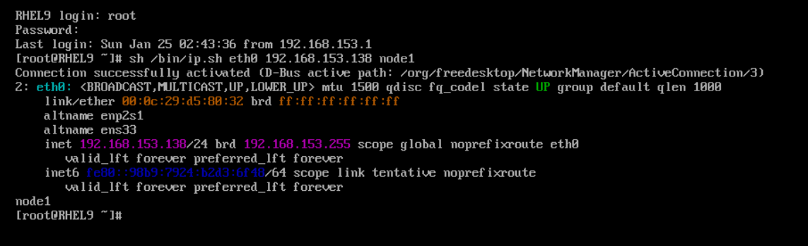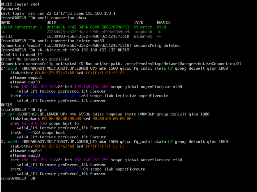 root@RHEL9 \~\]# nmcli connection show \[root@RHEL9 \~\]# nmcli connection delete ens33 \[root@RHEL9 \~\]# nmcli connection delete Wired\\ connection\\ 1 \[root@RHEL9 \~\]# ip.sh eth0 192.168.153.137 RHEL9