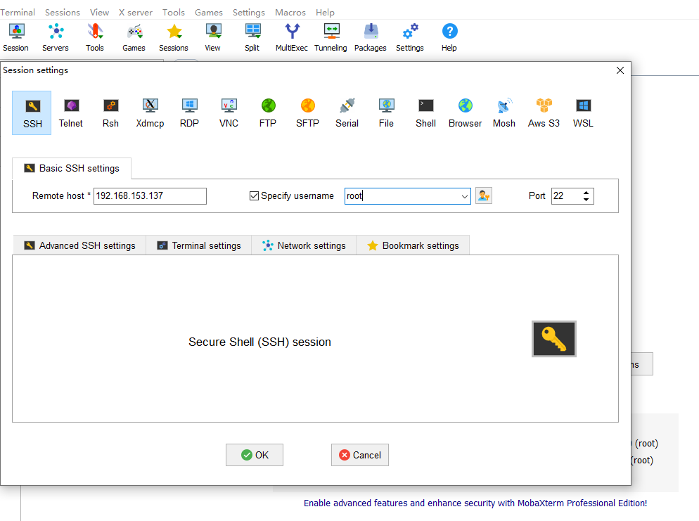 点击左上角的Session------SSH,然后输入IP地址、root用户