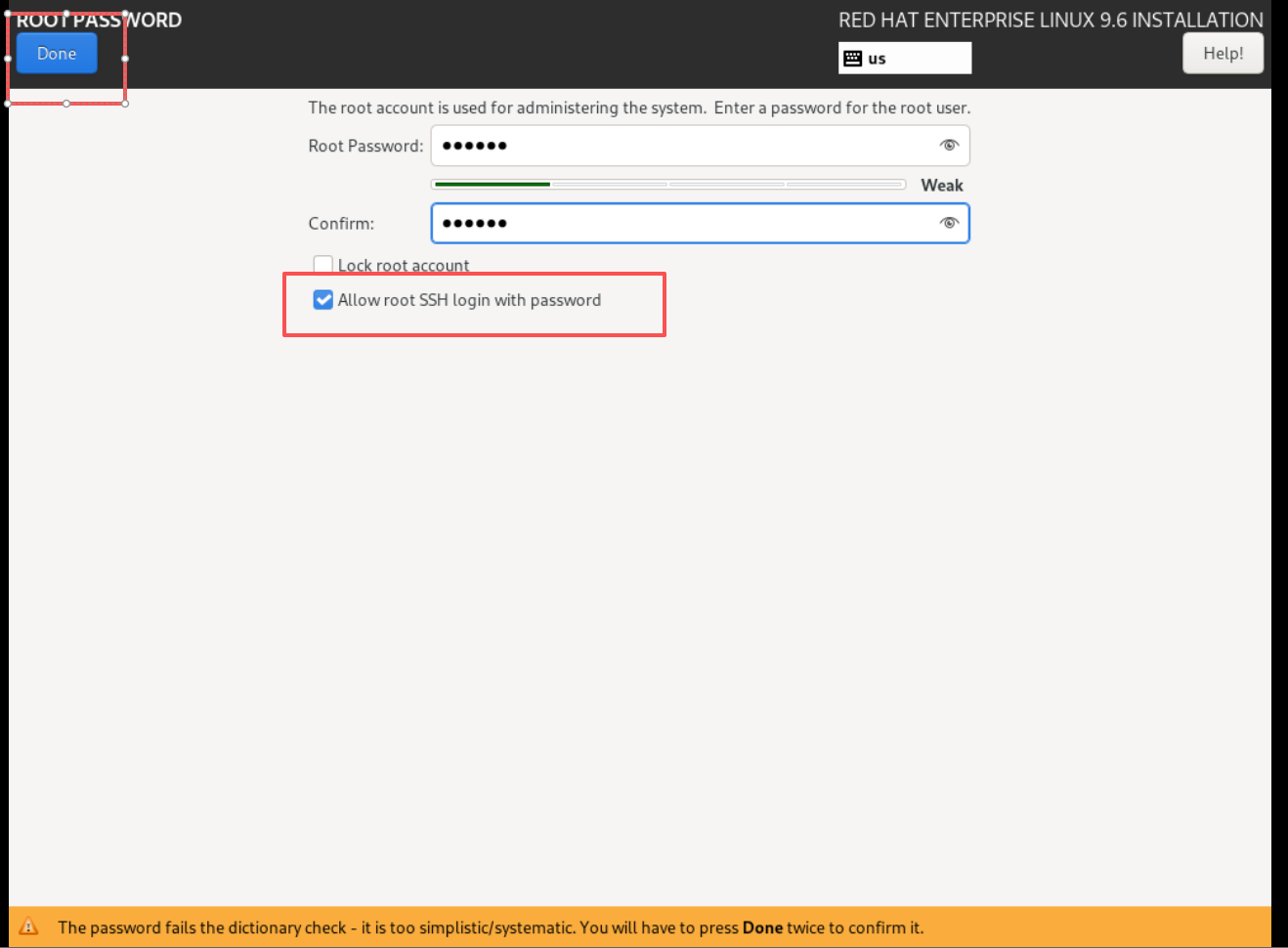 点击Root Password------输入密码,勾选Allow···,再点击Done
