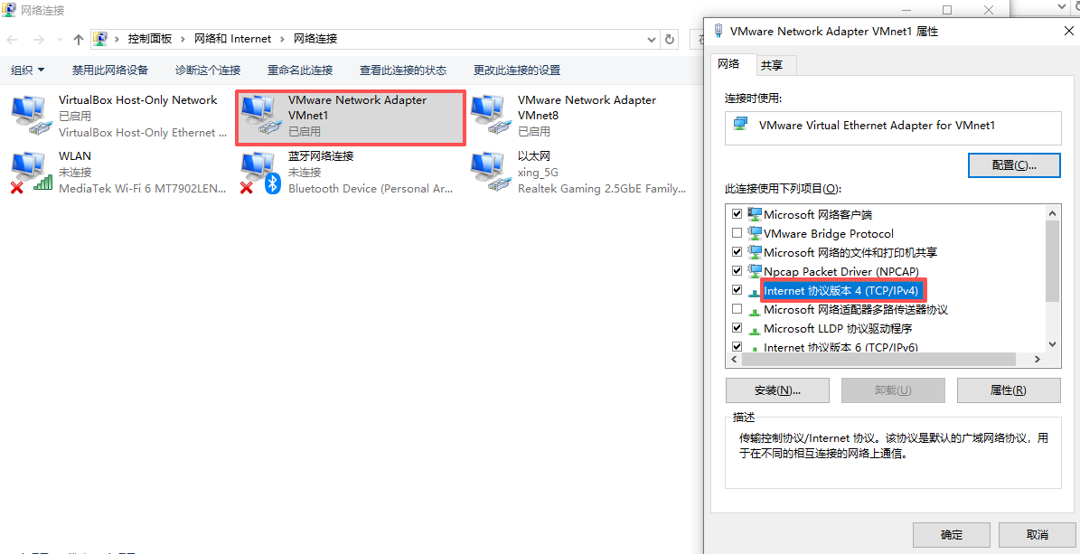 如果不想修改虚拟机的IP网段,则可以修改Windows的VMwara的IP网段;按Win键+S键输入控制面板,点击控制面板------网络和Internet------网络和共享中心------更改适配器设置------又击VMnet1/VMnet8------属性------双击Internet协议版本4------修改IP网段