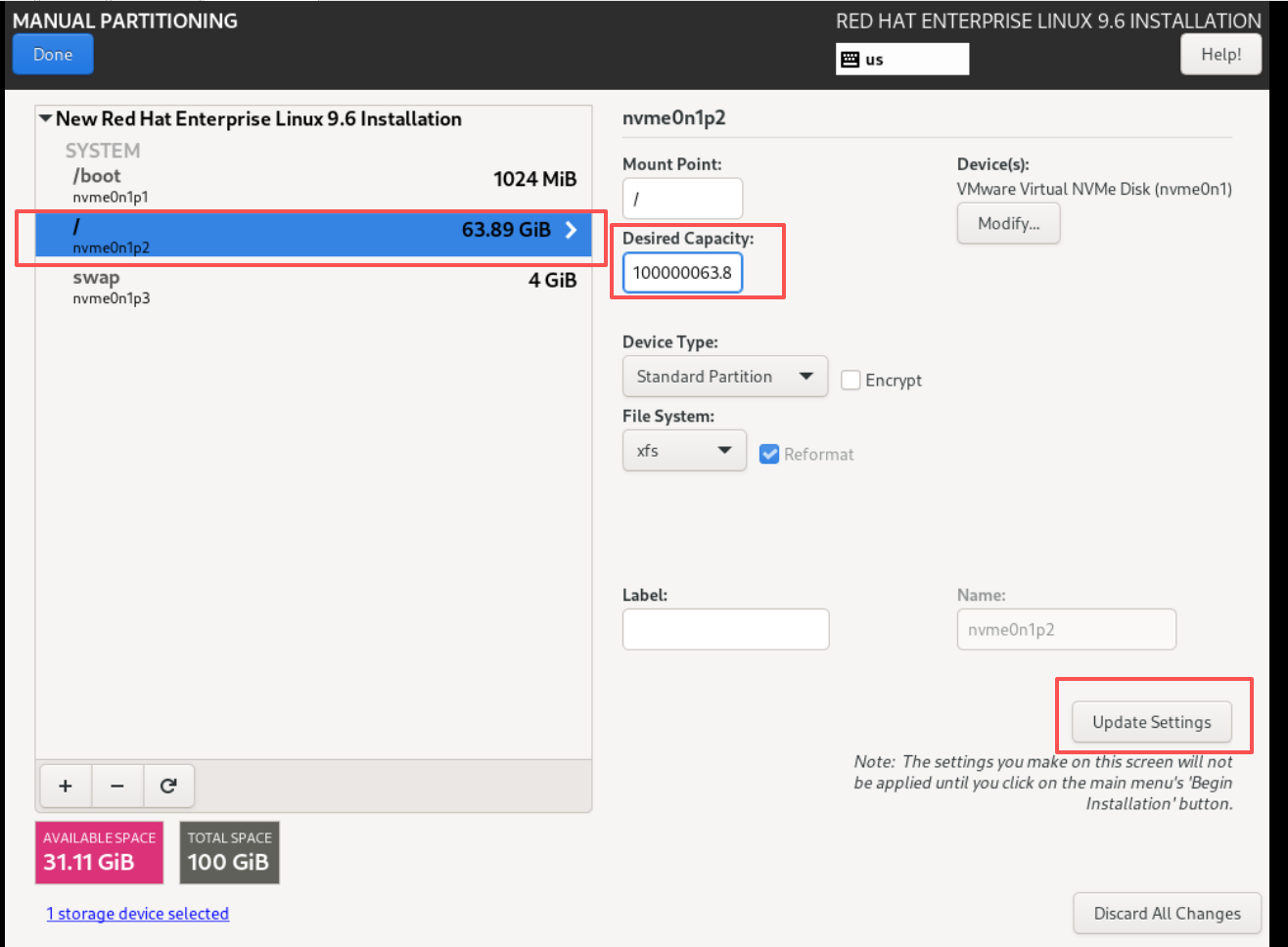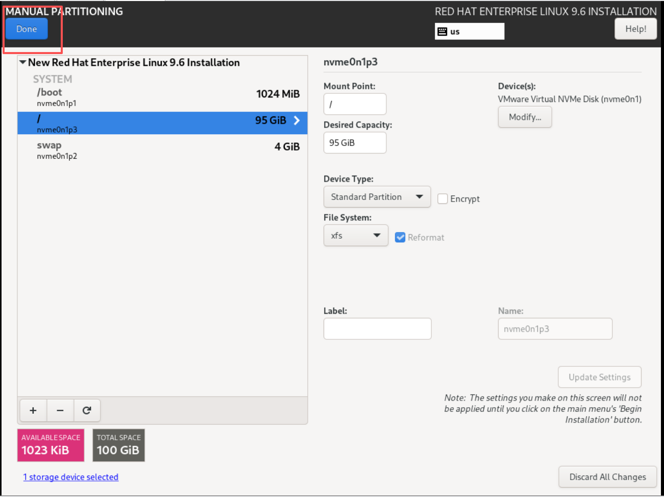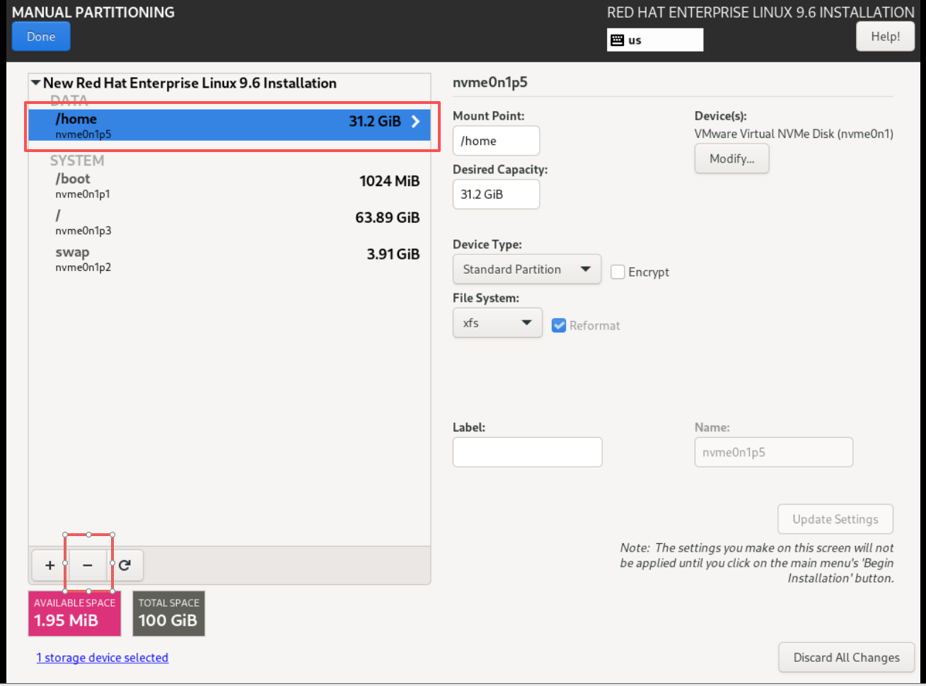 点击Installation Destination------编辑安装位置,选择Custom然后点击左上角的Done;选择Standard Partition------Click··· ,然后删除/home分区,设置/boot------1G,/swap------4G,/------95G(Update Settings------更新设置);点击左上角的Done,然后点击Accept Changes