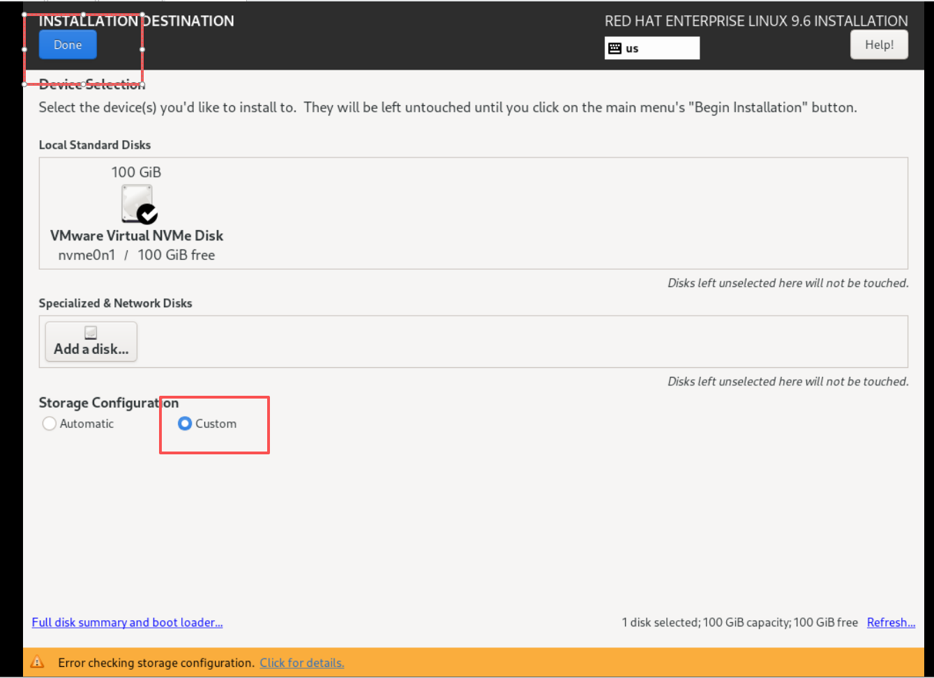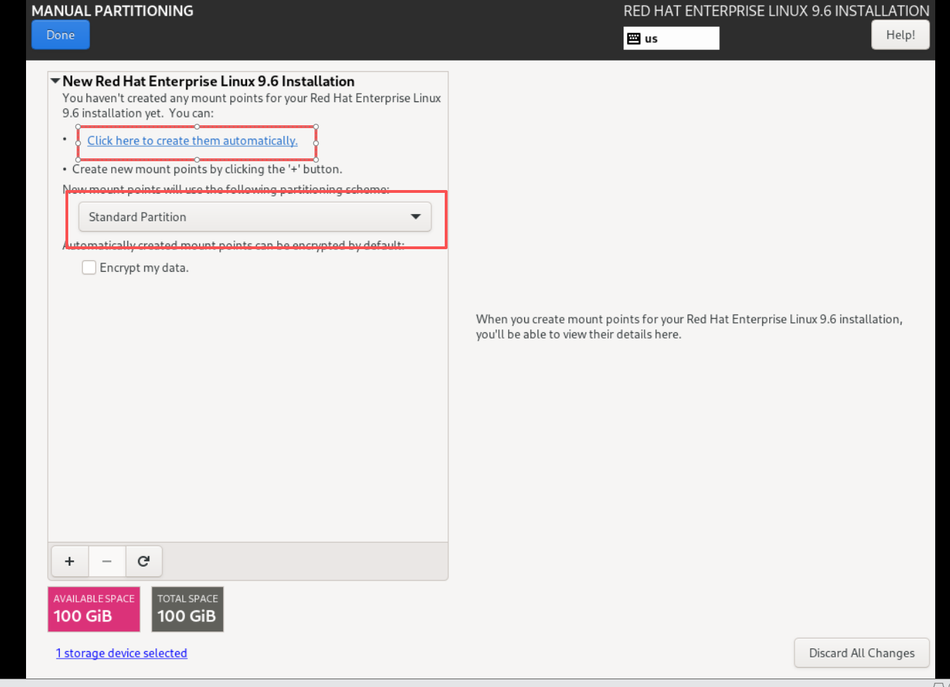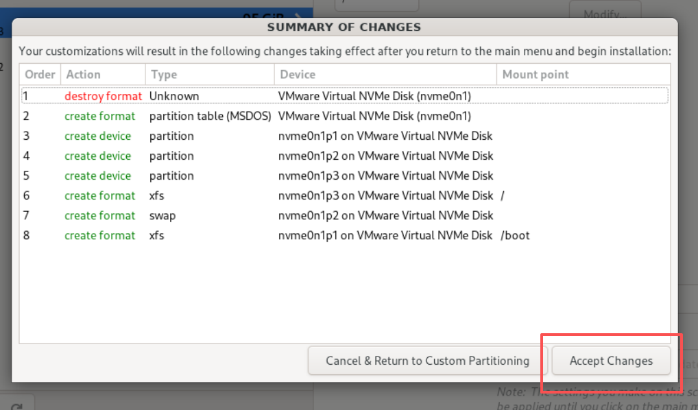 点击Installation Destination------编辑安装位置,选择Custom然后点击左上角的Done;选择Standard Partition------Click··· ,然后删除/home分区,设置/boot------1G,/swap------4G,/------95G(Update Settings------更新设置);点击左上角的Done,然后点击Accept Changes