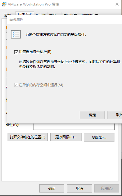 右击VMwara------属性------快捷方式------高级------勾选用管理员身份运行------依次点击确定