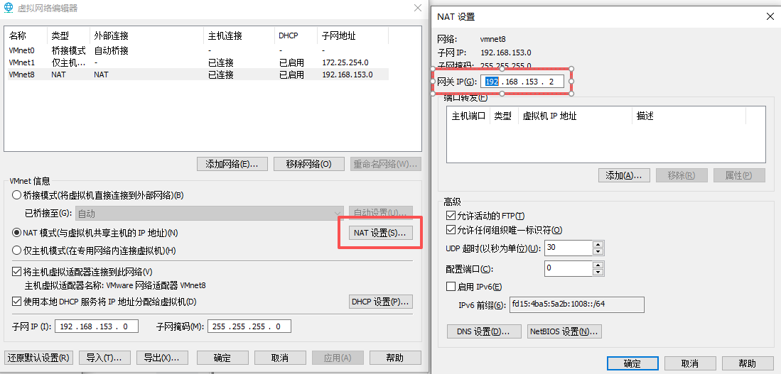 注意自己NAT的网关,之后的NAT网卡的主机都要配好自己的网关,否则虚拟机远程连接不了;点击VMnet8 NAT···------NAT设置------查看网关
