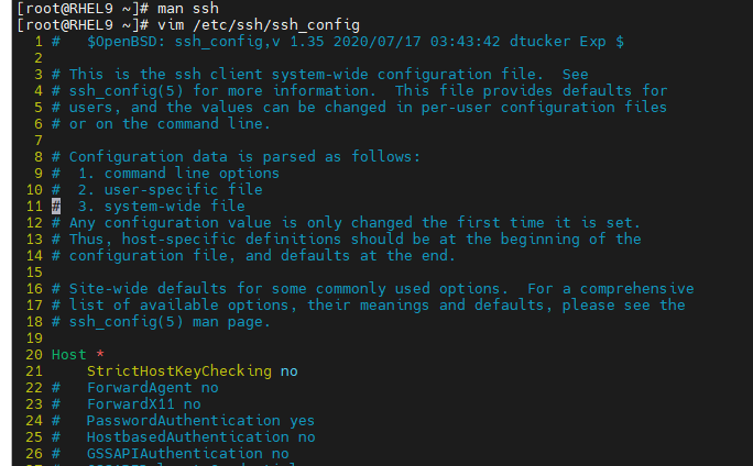 root@RHEL9 \~\]# vim /etc/ssh/ssh_confi 20 Host \* 21 StrictHostKeyChecking no