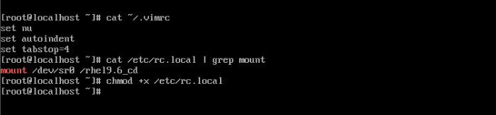 root@RHEL9 \~\]# vim \~/.vimrc 1 set nu 2 set autoindent 3 set tabstop=4 \[root@RHEL9 \~\]# vim /etc/rc.local 1 #!/bin/bash 2 # THIS FILE IS ADDED FOR COMPATIBILITY PURPOSES 3 # 4 # It is highly advisable to create own systemd services or udev rules 5 # to run scripts during boot instead of using this file. 6 # 7 # In contrast to previous versions due to parallel execution during boot 8 # this script will NOT be run after all other services. 9 # 10 # Please note that you must run 'chmod +x /etc/rc.d/rc.local' to ensure 11 # that this script will be executed during boot. 12 13 touch /var/lock/subsys/local 14 15 mount /dev/sr0 /rhel9_cd \[root@RHEL9 \~\]# chmod +x /etc/rc.local