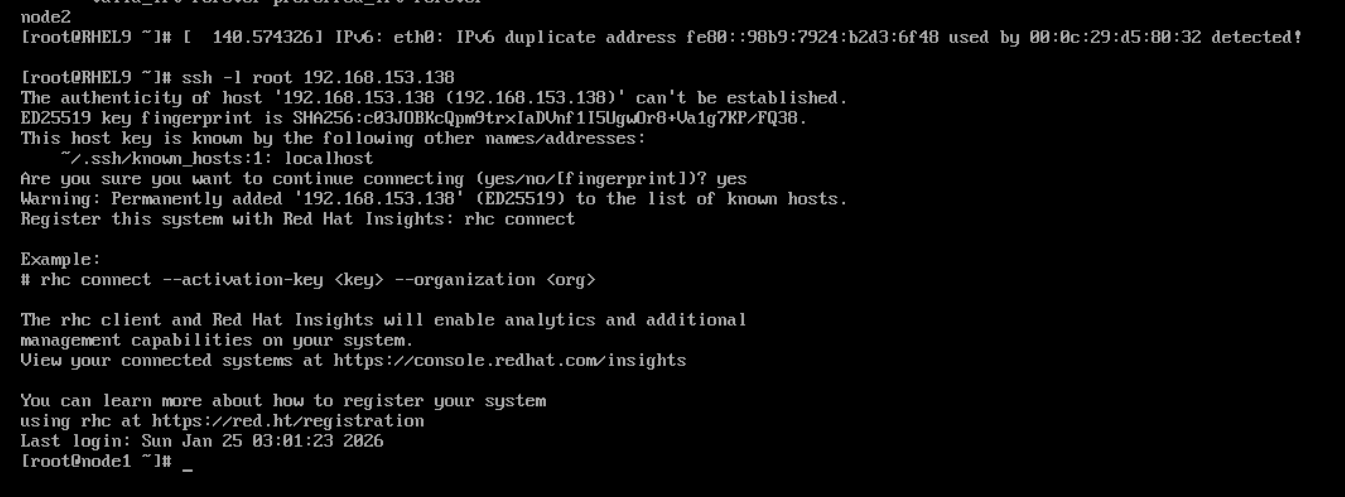 关闭虚拟机后,删除之前克隆出来的node1、node2两台虚拟机(右击该虚拟机------管理------从磁盘中删除),再次通过母盘RHEL9.6_db克隆出两台虚拟机,设置ip,测试远程登录