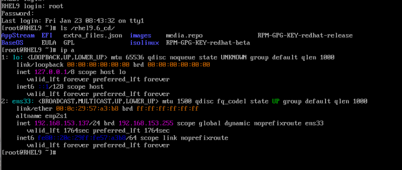 查看挂载目录/rhel9.6_cd是否成功自动挂载镜像,然后再查看ip,用MobaXterm来远程连接虚拟机,方便敲代码