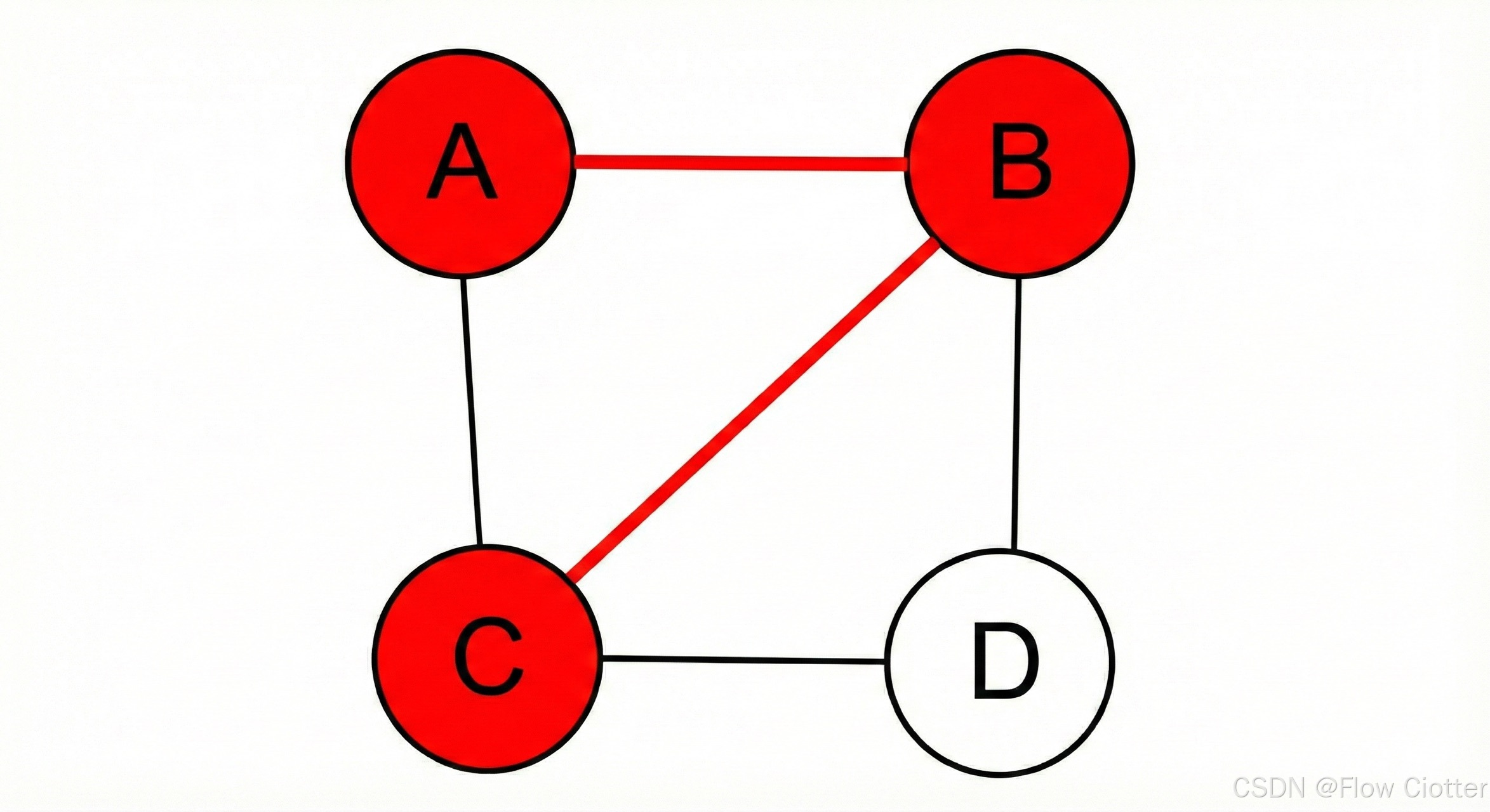假设我们要找出从顶点 A 到顶点 C 的一条路径。通过观察图,我们可以找到一条路径:A -> B -> C。在下图中,我们将这条路径以及路径上的顶点用红色高亮显示出来。这演示了如何利用图论模型来解决实际的连接性问题。