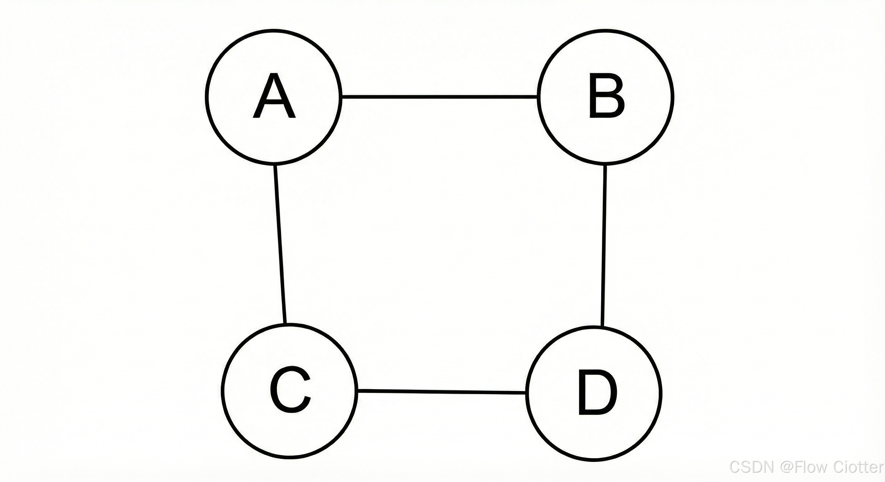 在下图中,我们建立了如下关系:A与B相连,B与C相连,C与D相连,D与A相连。这就形成了一个简单的环形图。这可以代表城市之间的直达航班,或者社交网络中的好友关系。