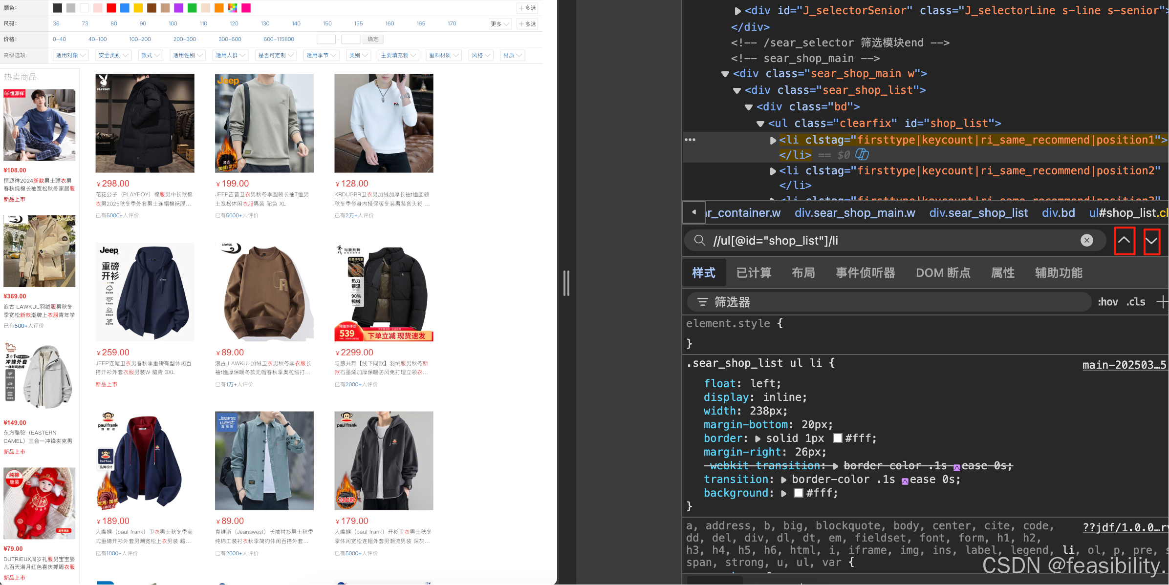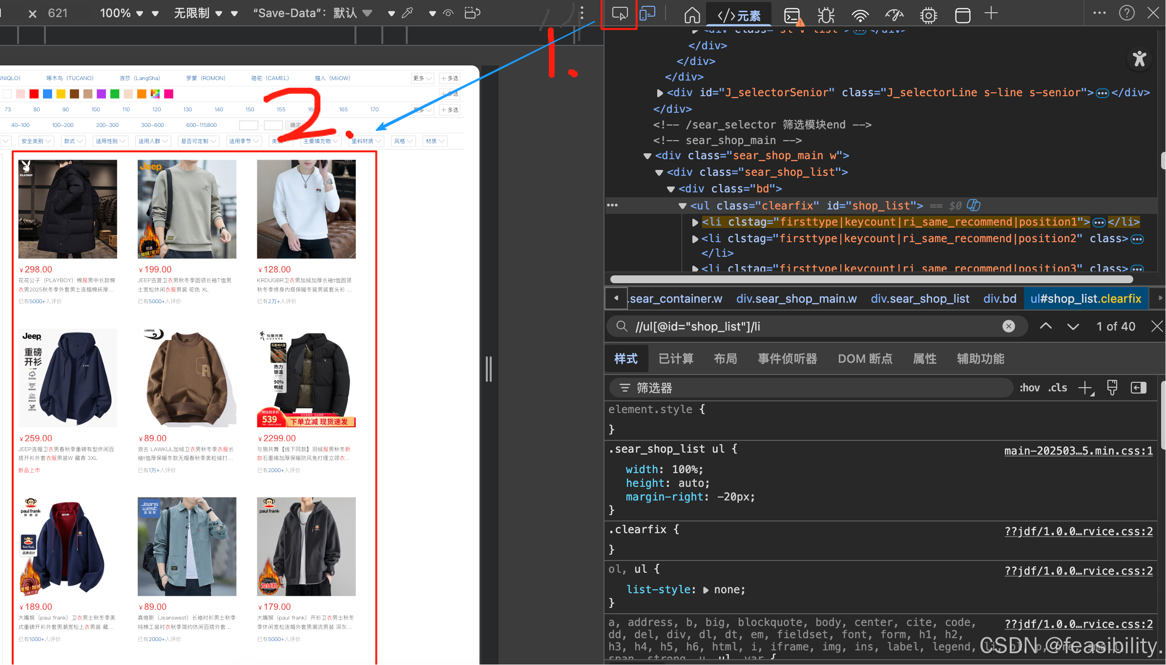 点击鼠标右键,会出现右键菜单,里面有"检查"(Chrome/Edge)或"检查元素"(Firefox)等类似选项(这与浏览器相关),点击后会出现开发者工具(DevTools),选择元素,再点击下图1的'鼠标'图标,然后指向商品,你会发现主页商品的元素与"shop_list"这个id元素有关,按CTRL+F,输入xpath语句//ul[@id="shop_list"]/li,可以发现找到40个元素
