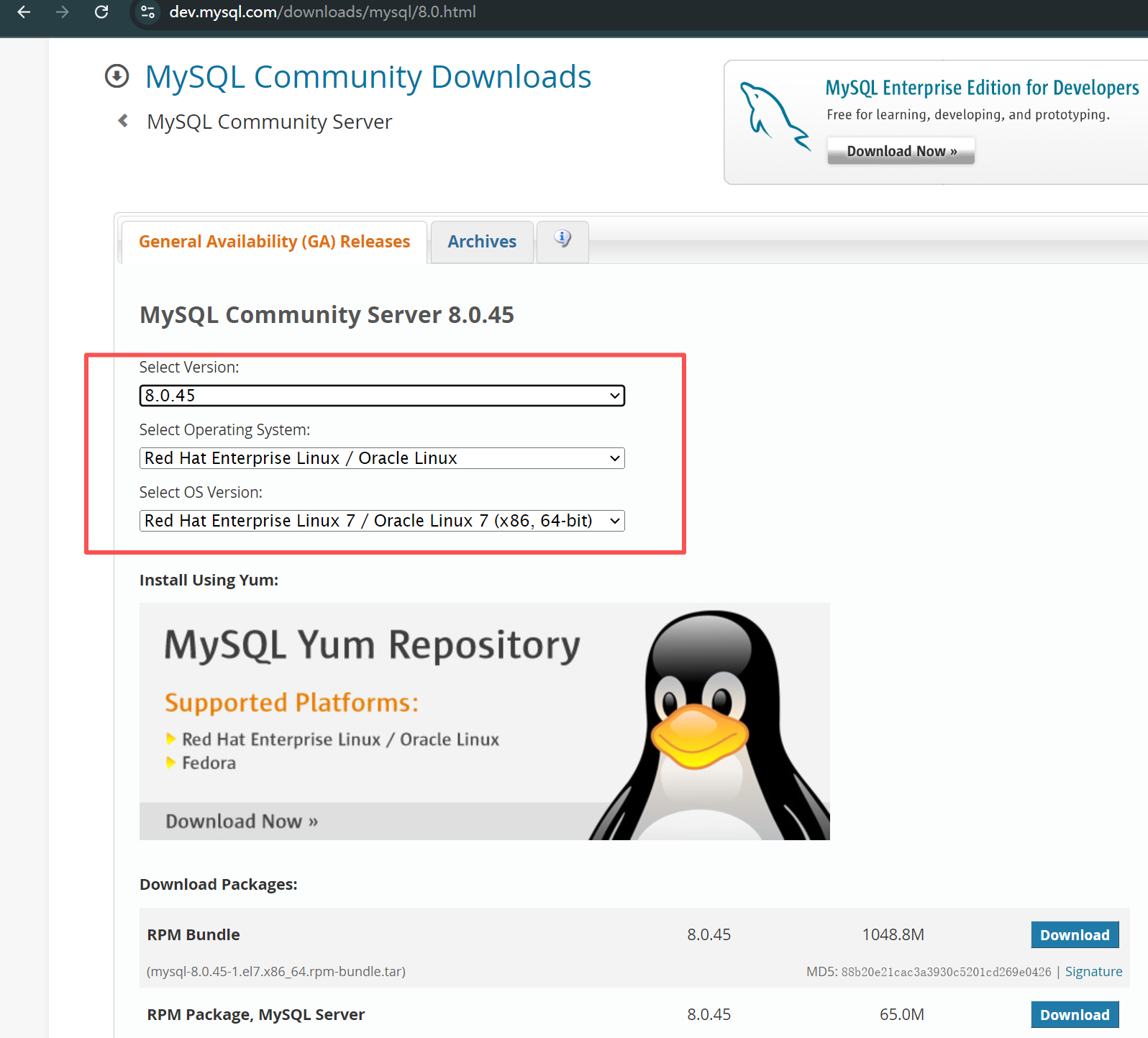 - 下载 MySQL 8.0.45 RPM Bundle(推荐 el7 版,兼容性最好):