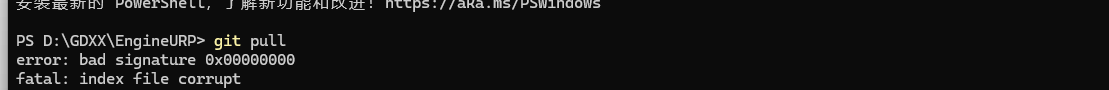 - 输入git pull。发现报错,报错信息:error: bad signature 0x00000000 fatal: index file corrupt