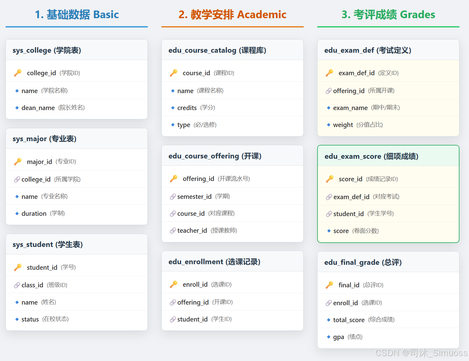 假设学校教务系统数据库设计如下(已经非常简化了):