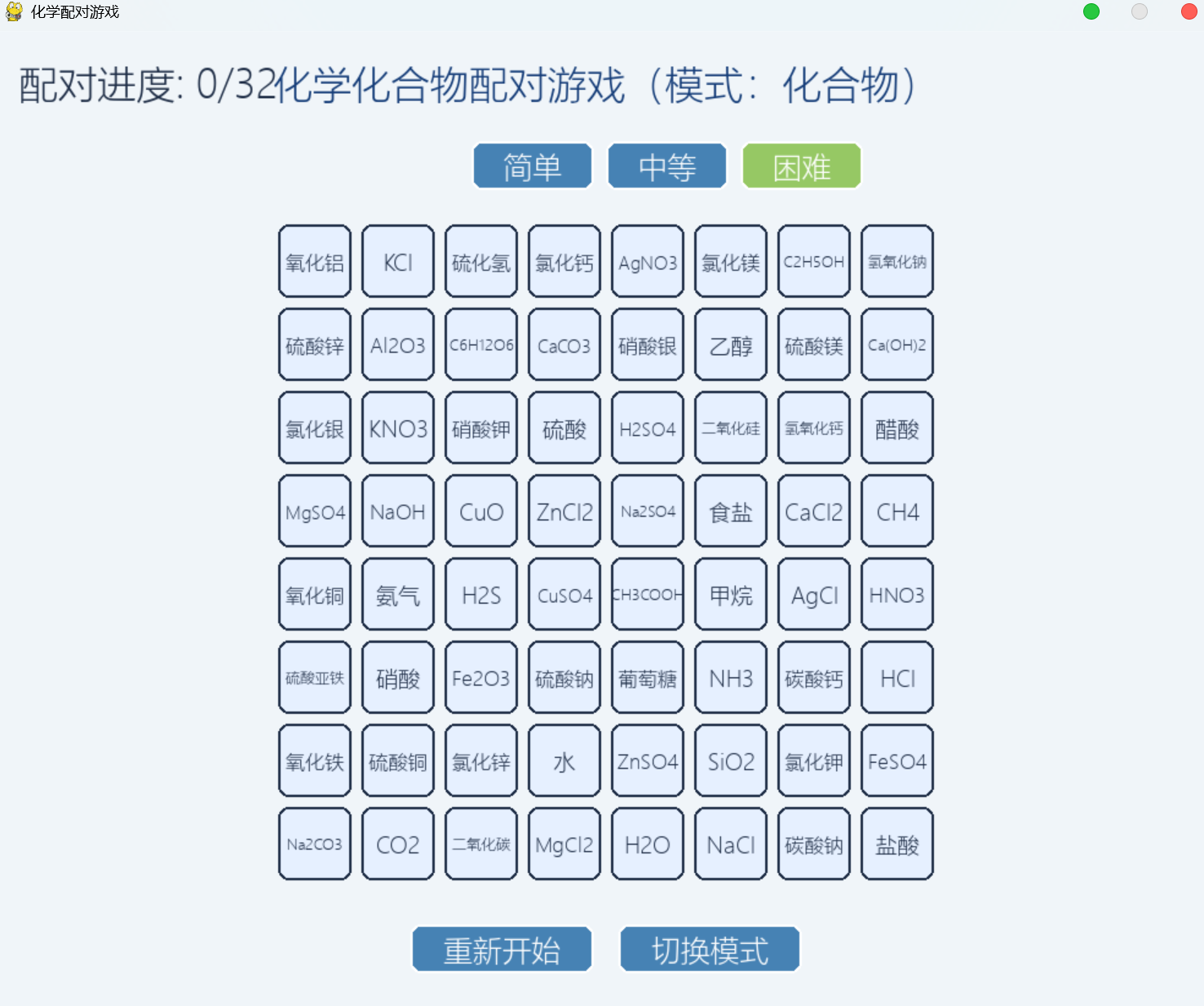 一款使用Python和Pygame开发的化学配对教育游戏,通过创新的记忆配对机制帮助学生学习化学知识。游戏包含元素和化合物两种模式,分别涵盖28种化学元素和32种常见化合物,玩家需要在网格中点击匹配中文名称与对应化学式。游戏设计了三个难度级别(4×4、6×6、8×8网格),具有自适应界面布局、智能字体调整、震动反馈效果和完整的游戏流程管理,既能让学生在轻松互动中掌握化学术语,又展示了如何将编程技术应用于教育领域,是一款兼具教育价值和编程学习意义的开源项目,因为化合物中的下标弄不出来,所以H₂O这种是H2O,也可以自己增加元素和化合物的种类。