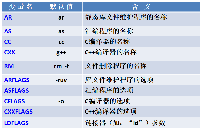 TARGET =目标AR 归档维护程序的程序名,默认值为 ar ARFLAGS 归档维护程序的选项