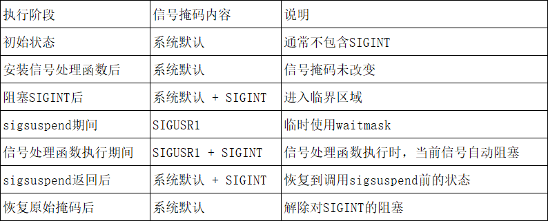 与sigsuspend的配合:sigsuspend临时替换信号掩码,但当信号处理函数执行时,系统仍会自动阻塞当前信号