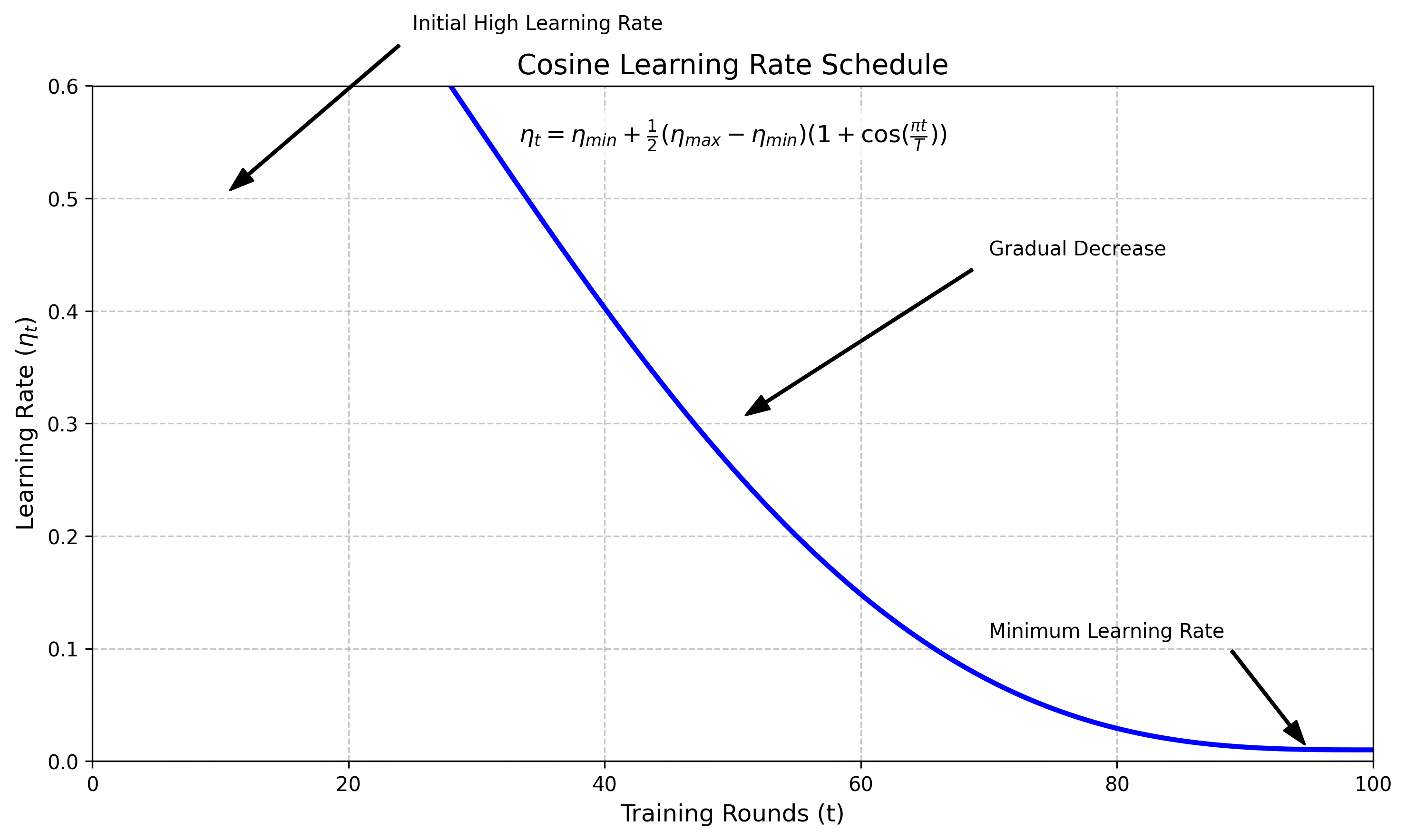 η t = η m i n 2 ( 1 + cos ( π ⋅ t T ) ) \eta_t = \frac{\eta_{min}}{2}\left(1 + \cos\left(\frac{\pi \cdot t}{T}\right)\right) ηt=2ηmin(1+cos(Tπ⋅t))