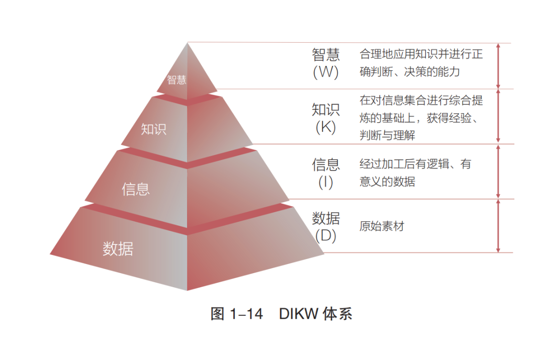 DIKW模型:呈金字塔层级,即**"数据(原始素材)→信息(有逻辑的数)→知识(经整合的经验)→智慧(合理决策的能力)"**