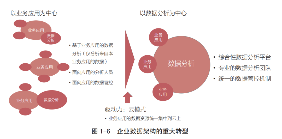核心是云模式驱动下,企业数据架构从 "以业务应用为中心" 转向 "以数据分析为中心" ,解决传统架构的数据孤岛等问题:
