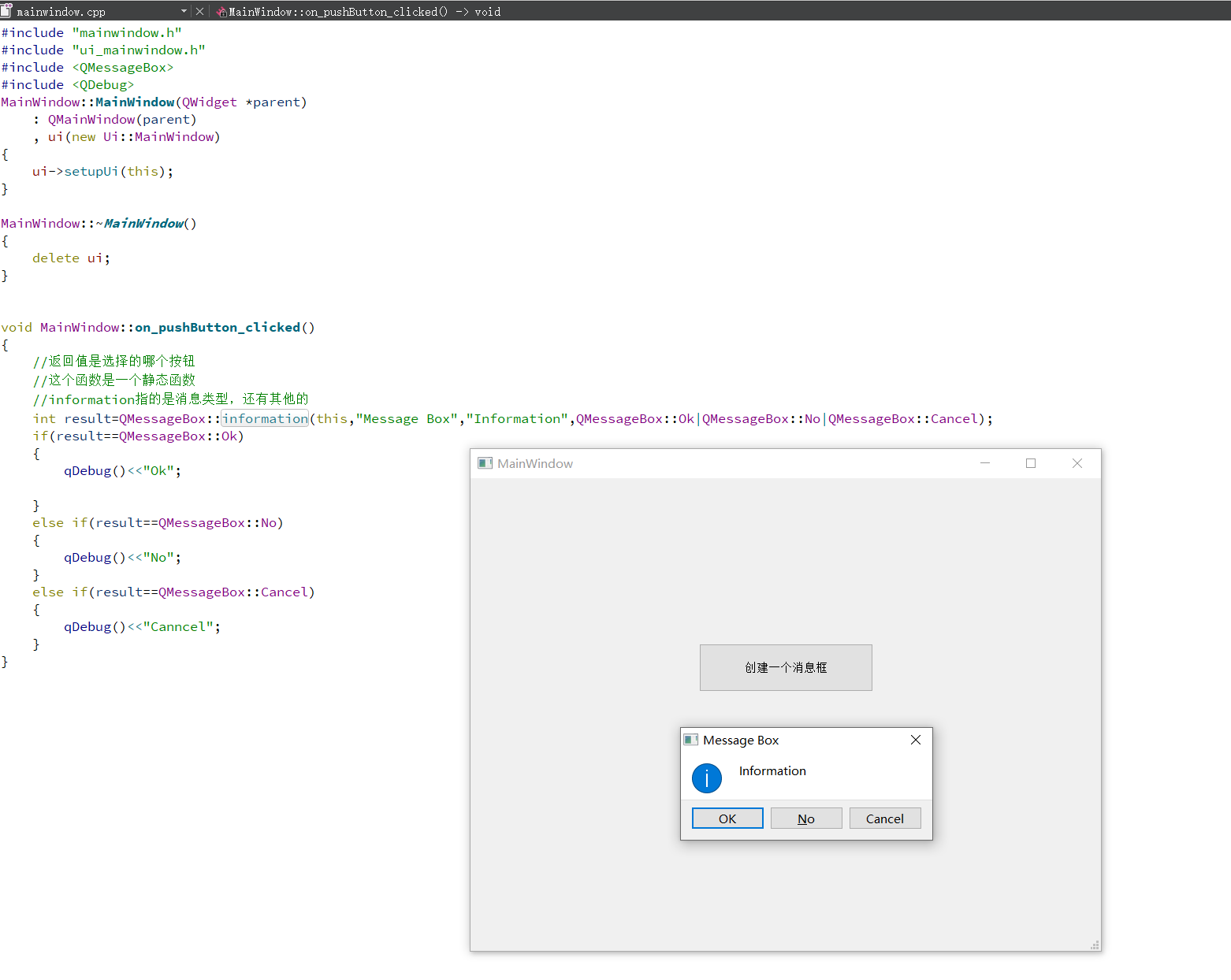 上面只展示了information一种消息类型,其他的类型就是我们前面所讲的QMessageBox给我们提供的图标他们所代表的枚举值
